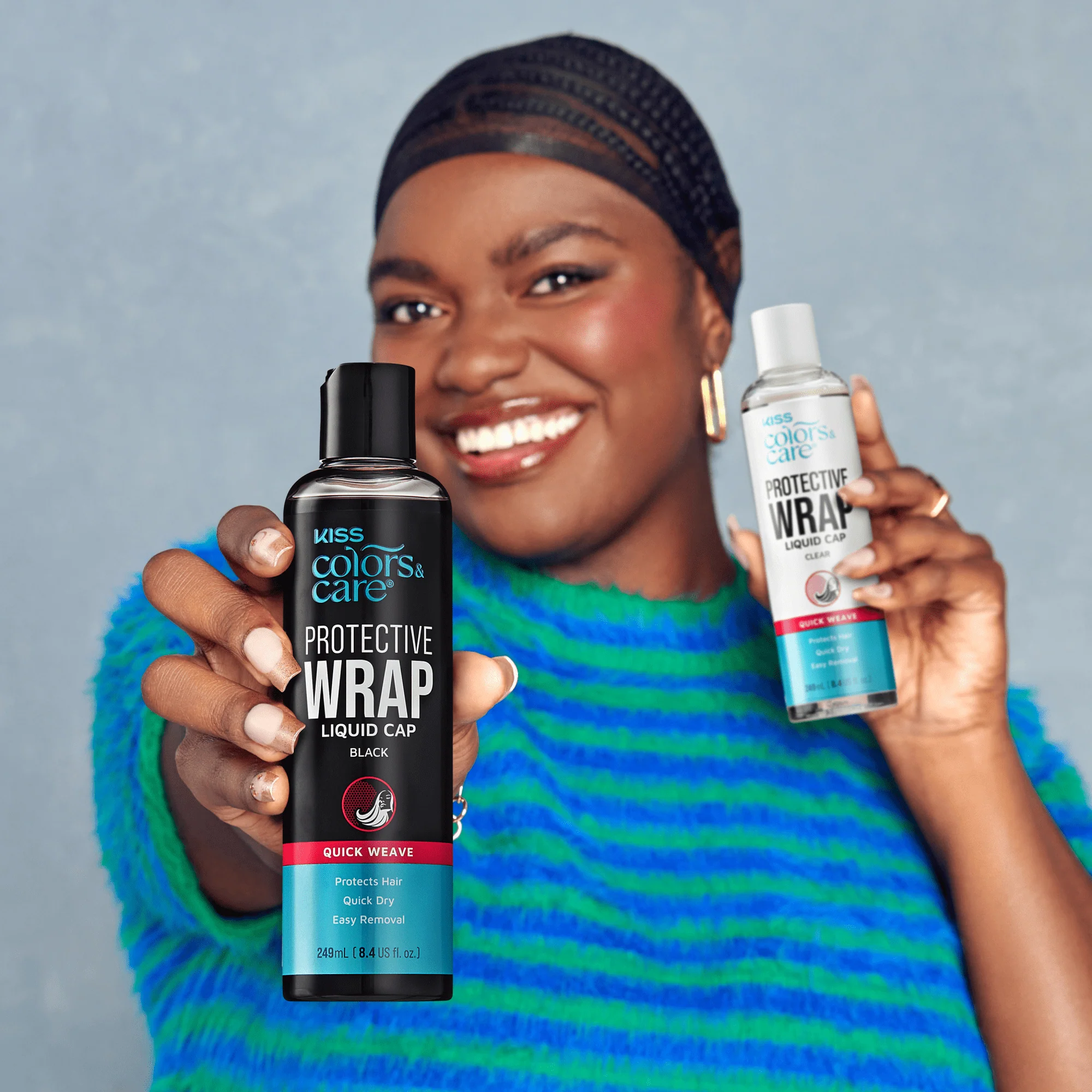 The highest quality protective solution for quick weave installations. KISS Colors & Care Quick Weave Protective Wrap Liquid Cap shields hair and scalp from glue, ensuring smooth, safe, and mess-free application every time.