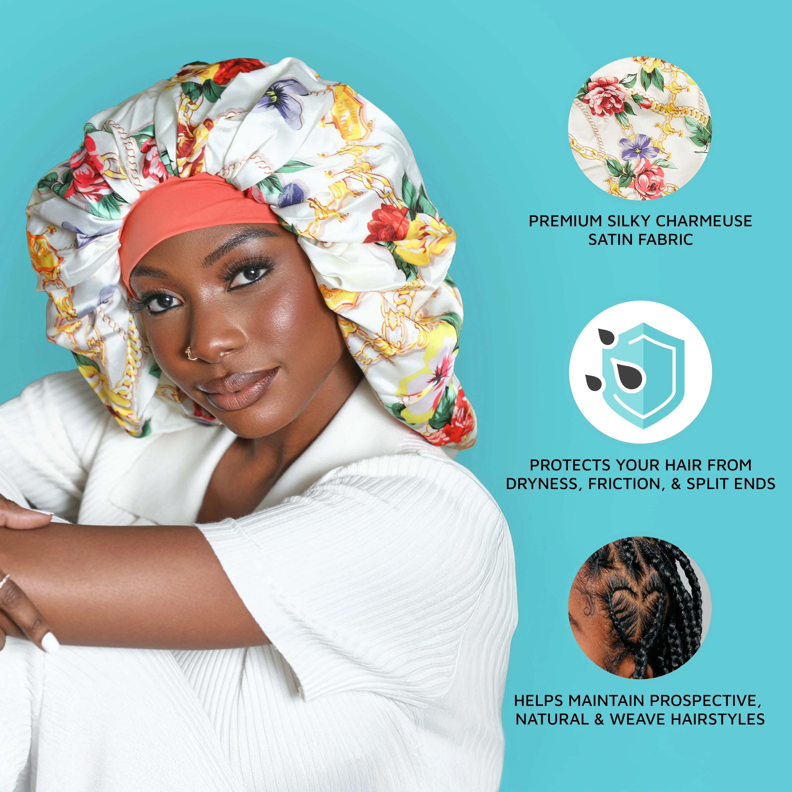 KISS Colors & Care Reversible Braid Bonnet is made with luxurious crepe satin that protects your hair from dryness, friction, and split ends. Made with two different densities of silky polyester to help maintain healthy hair and natural curls.